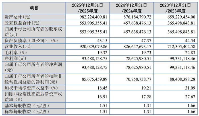 财务方面,于2023年、2024年及2025年,公司实现营业收入分别约为7.12亿元、8.27亿元、9.20亿元人民币;同期净利润分别约为9933.11万元、7862.60万元、9348.81万元人民币。