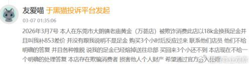 2026年3月7日,有消费者在黑猫投诉平台表示,在东莞市大朗镇老庙黄金(万荟店)被欺诈,该名消费者以18k金换足金并且要补853元差价,而店员并未跟消费者表明不是足金。再联系店员后,店员不仅不给明确的答复,同时各种推脱,表示足金已经熔掉送往总部。对于商家欺骗消费者的行为,该消费者要求官方介入处理。