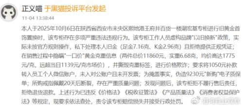 2025年11月,黑猫投诉平台显示,有消费者曾在10月陕西省西安市未央区熙地港王府井百货一楼潮宏基专柜进行旧黄金首饰置换时,该专柜存在多项严重违法违规行为。该专柜工作人员虚构品牌“以旧换新”政策,实际未按官方规则操作,私下处理本人旧金(足金7.16克、K金2.96克)且拒绝提供正规凭证;在销售过程中隐瞒“一口价”黄金克重信息(两件总价11860元,实重6.68克,均价高达1775元/克,远超当日1139元/克市场价),并撕毁克重标签,进行价格欺诈;要求将1050元补款转入员工个人微信账户,未入对公账户且未开发票;为掩盖事实,伪造9230元“新购”电子质保单;所购戒指佩戴20天后断裂,存在严重质量问题;发现问题后,该专柜拒不履行售后责任,拒绝退货退款。上述行为已违反《价格法》《税收征管法》《产品质量法》《消费者权益保护法》等规定,现要求依法查处,责令该专柜赔偿损失并接受行政处罚。