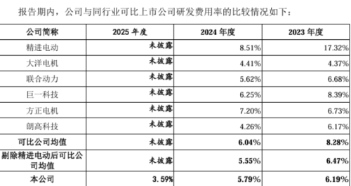 招股书披露,报告期各期可比公司平均研发费用率分别为10.26%、8.28%、6.04%和5.98%。精进电动的研发费用率显著高于其他可比公司,剔除精进电动后,报告期各期可比公司研发费用率的均值分别为7.60%、6.47%、5.55%和6.50%。