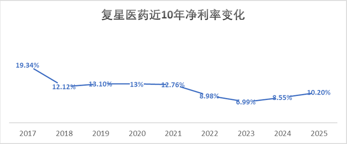 说到利润,复星整体利润率还是偏低的。尽管这些年营收一直在增加,但因为集采的冲击,新旧转换没衔接好,这几年净利率水平降到了10%的区间。