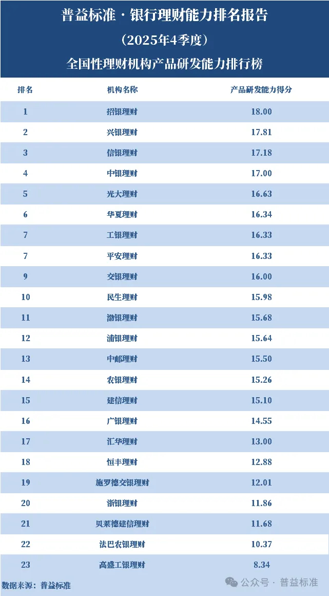 2025年4季度,兴银理财收益能力居于全国性理财机构第一,产品研发能力排名第二,发行能力排名第三,信息披露友好性排名第五,综合能力位列全国性理财机构首位;信银理财发行能力位列全国性理财机构第一,运营管理能力排名第二,产品研发能力排名第三,信息披露友好性排名第四,收益能力排名第五,综合能力位列全国性理财机构第二;招银理财产品研发能力位列全国性理财机构第一,发行能力和收益能力均位列第二,其他各项也无短板,综合能力位居全国性理财机构第三。