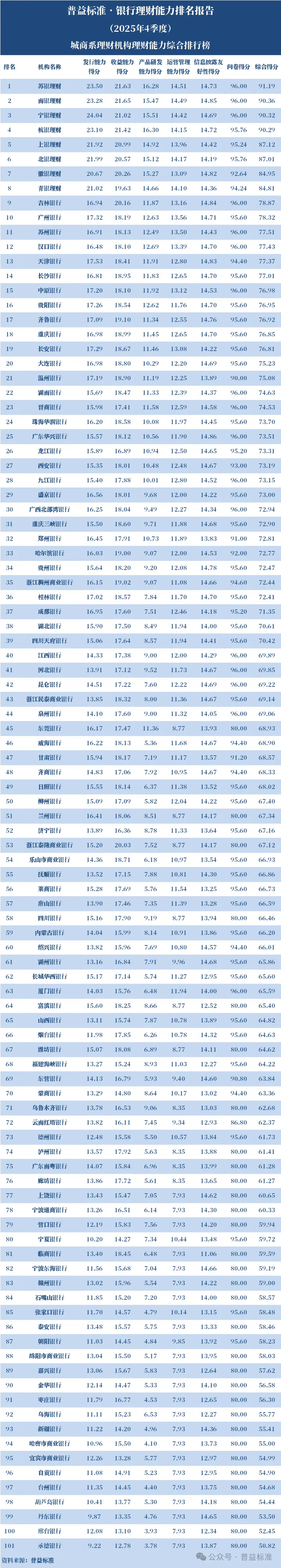 2025年4季度,城商系理财机构中,理财能力综合排名前十的依次是苏银理财、南银理财、宁银理财、杭银理财、上银理财、北银理财、徽银理财、青银理财、吉林银行、广州银行。