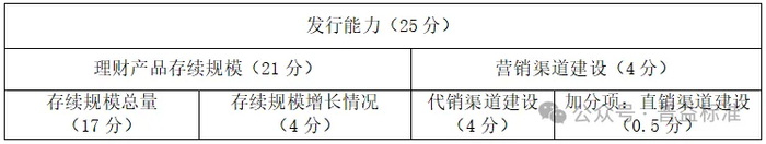 发行能力相关考核内容包括存续规模和渠道建设两大方面。存续规模从净值型理财产品存续规模总量和增量两方面考察,其中规模总量中增加考察非现管理财产品存续规模占比。渠道建设分为代销渠道和直销渠道两方面考察,直销渠道作为加分项,代销渠道在原有的代销渠道数量考察基础上增加对代销渠道质量的考察,同时对非母行渠道布局亦有考察评估。