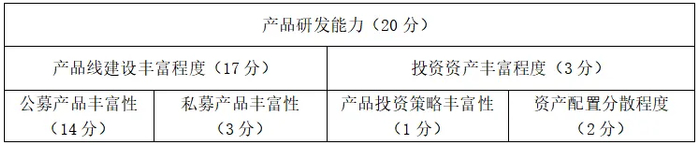 产品研发能力主要考察产品线建设丰富程度和投资资产丰富程度两方面。产品线建设丰富程度将针对公募、私募产品分别考察,以更加合理地反映不同类型客户群体对产品研发的需求差异。投资资产丰富程度一方面考察机构所发行理财产品的投资策略丰富性,另一方面考察机构的大类资产和前十持仓资产配置分散度。