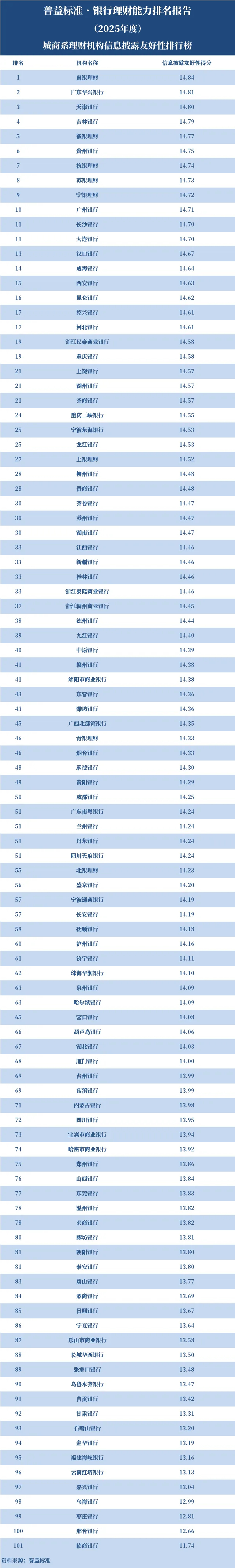 2025年度,城商系理财机构中,信息披露友好性排名前十的依次是南银理财、广东华兴银行、天津银行、吉林银行、徽银理财、贵州银行、杭银理财、苏银理财、宁银理财、广州银行。