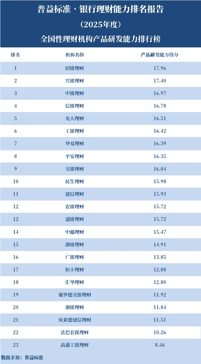 2025年度,全国性理财机构中,产品研发能力排名前五的依次是招银理财、兴银理财、中银理财、信银理财、光大理财。