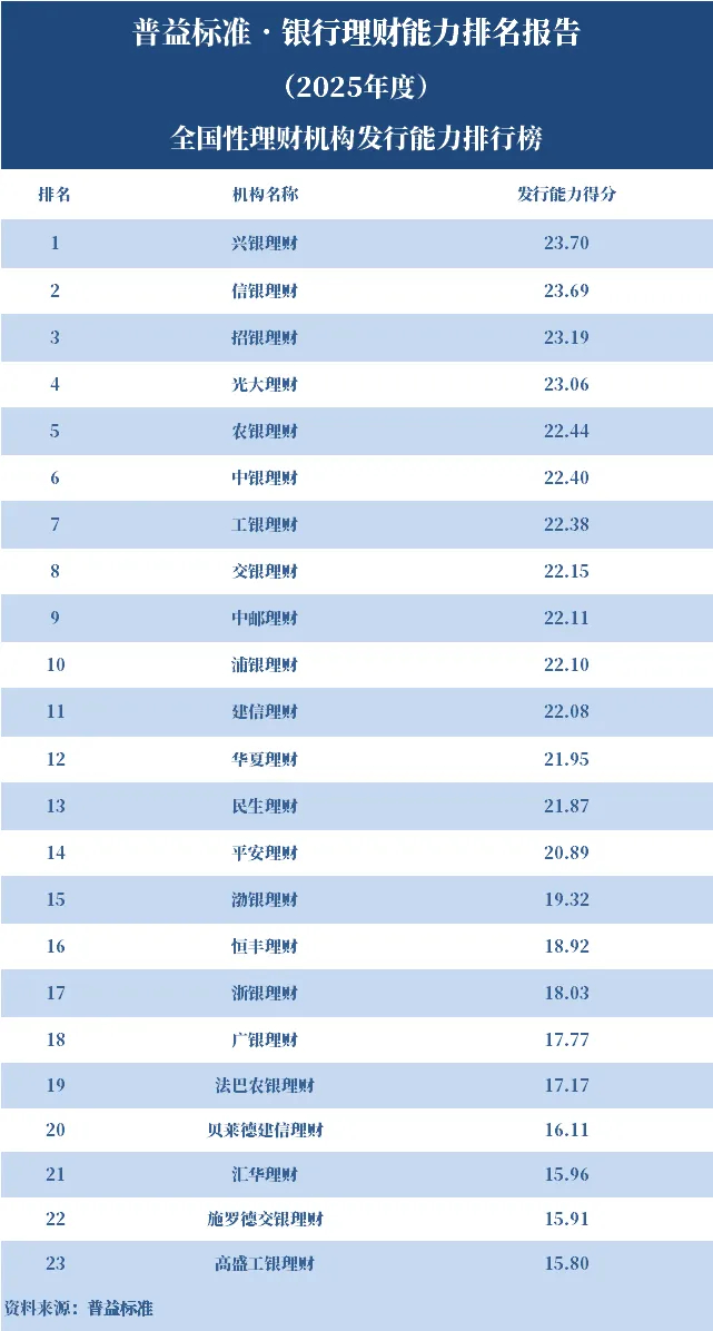 2025年度,全国性理财机构发行能力表现良好,平均分为20.39分。在该项指标排名前十的机构中,国有行及其理财公司与股份行及其理财公司比例为5:5。净值型产品发行能力方面,23家理财机构累计规模同比显著上升13.89%。