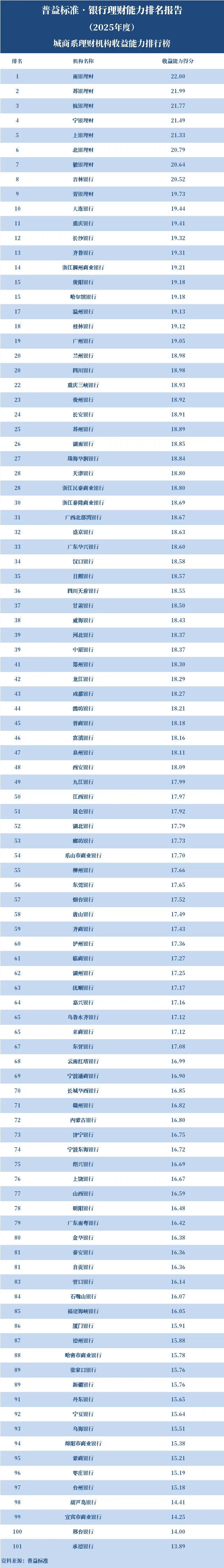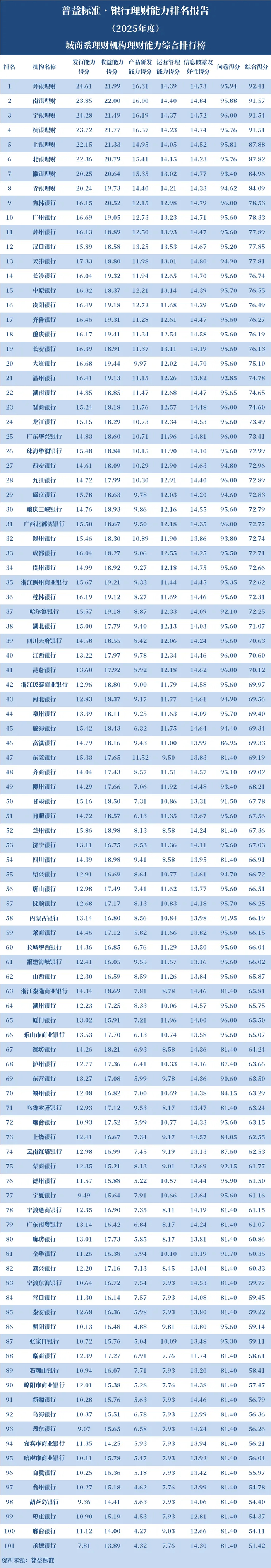 2025年,城商系理财机构中,理财能力综合排名前十的依次是苏银理财、南银理财、宁银理财、杭银理财、上银理财、北银理财、徽银理财、青银理财、吉林银行、广州银行。