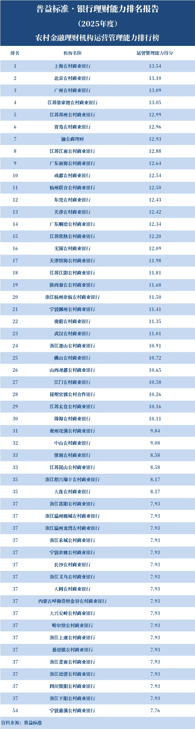 2025年度,农村金融理财机构中,运营管理能力排名前十的依次是上海农商银行、北京农商银行、广州农商银行、江苏张家港农商银行、江苏苏州农商银行、青岛农商银行、渝农商理财、江苏江南农商银行、广东南海农商银行、成都农商银行。