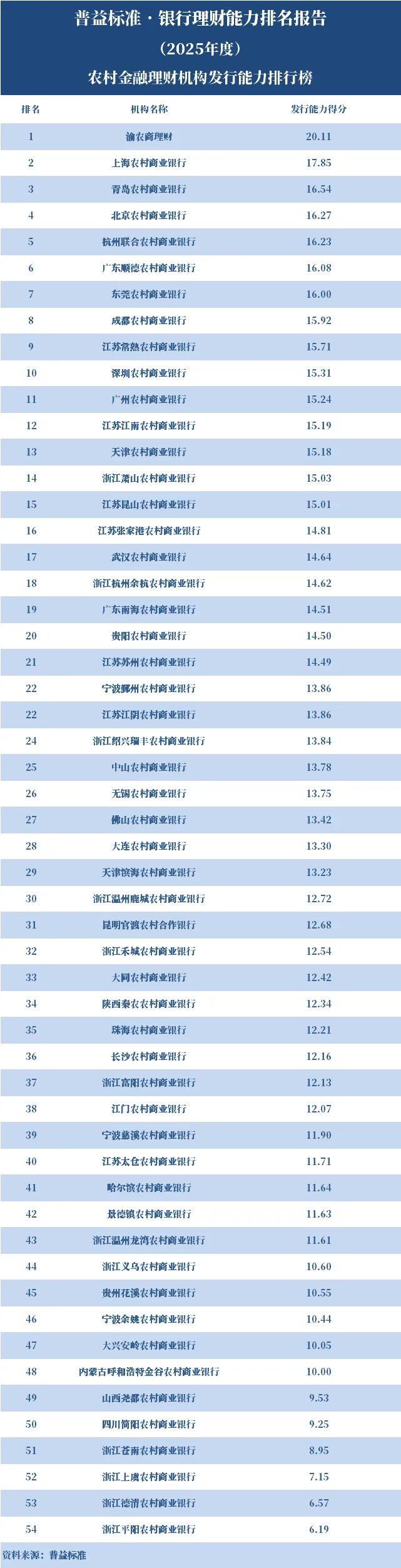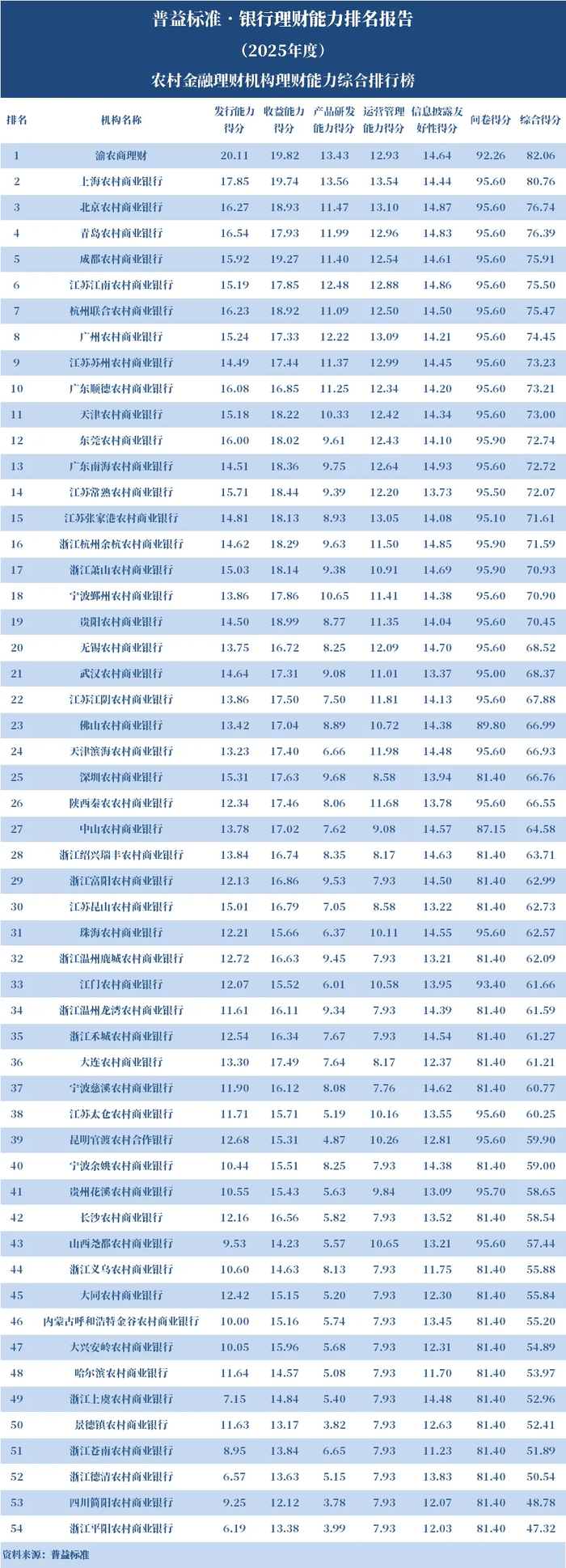 从数据统计来看,2025年参与排名的农村金融理财机构为54家,较2024年减少77家。渝农商理财发行能力、收益能力得分均位居农村金融理财机构首位,产品研发能力得分位居第二,其他各项也名列前茅,故其理财能力综合得分居于农村金融理财机构首位;上海农商银行产品研发能力和运营管理能力得分均位居农村金融理财机构首位,发行能力和收益能力得分位列第二,故其理财能力综合得分居于农村金融理财机构第二位;北京农商银行运营管理能力和信息披露友好性得分均位列农村金融理财机构第二,发行能力得分位列第四,收益能力得分位列第五,故其理财能力综合得分名列农村金融理财机构第三。
