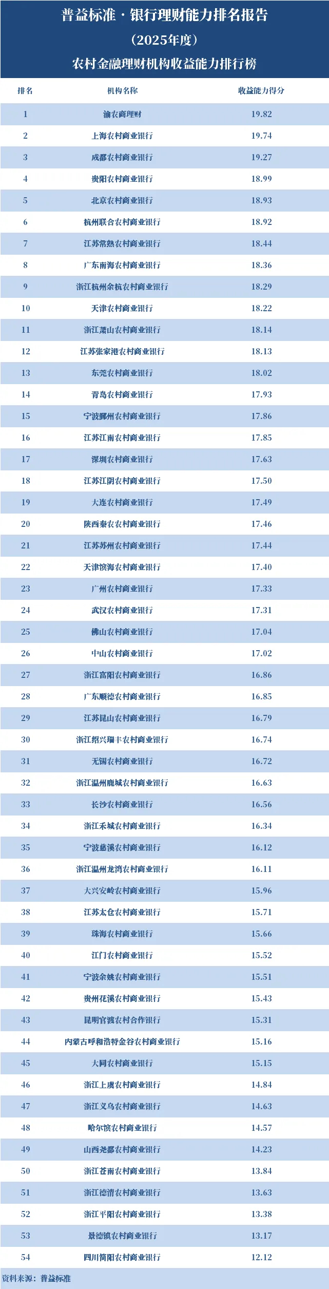 农村金融理财机构中,收益能力排名前十的依次为渝农商理财、上海农商银行、成都农商银行、贵阳农商银行、北京农商银行、杭州联合农商银行、江苏常熟农商银行、广东南海农商银行、浙江杭州余杭农商银行、天津农商银行。