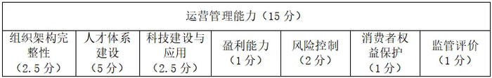 运营管理能力主要从组织架构完整性、人才体系建设、科技建设与应用、盈利能力(仅考核理财公司)、风险控制、消费者权益保护、监管评价等方面进行考察。