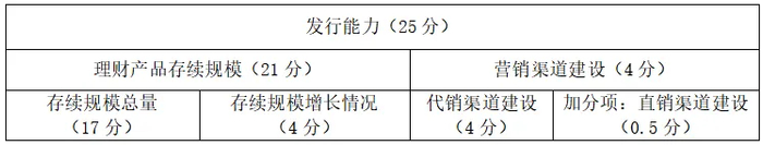 发行能力相关考核内容包括存续规模和渠道建设两大方面。存续规模从净值型理财产品存续规模总量和增量两方面考察,其中规模总量中增加考察非现管理财产品存续规模占比。渠道建设分为代销渠道和直销渠道两方面考察,直销渠道作为加分项,代销渠道在原有的代销渠道数量考察基础上增加对代销渠道质量的考察,同时对非母行渠道布局亦有考察评估。