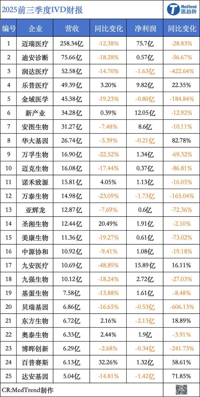 迪安诊断2025前三季度净利润仅5670.48万元,下降56.67%,万泰生物由于IVD价格压力以及费用率上升,2025前三季度直接亏损1.73亿元,同比下滑165.04%。金域医学亏损0.8亿元,同比下滑184.84%。个别如润达医疗(净利润同比下滑422.64%)、贝瑞基因(净利润同比下滑606.13%)、利德曼(净利润同比下滑765.83%)。