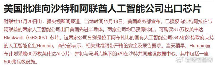 美国批准向沙特和阿联酋人工智能公司出口芯片