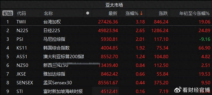 今天凌晨英伟达交出完美答卷,提振市场对AI的信心,盘后涨超5%,带动纳指期货涨超1%,今天亚太股市也是全线上涨,中国台湾加权指数大涨3.18%,日经225大涨2.65%,韩国综合指数涨近2%。