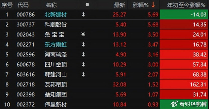 今天盘中有房地产小作文,地产链一度拉升,我爱我家盘中一度涨停,北新建材大涨5.69%,科顺股份大涨5.68%。