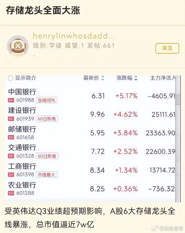 到A股这边,科技股高开被砸盘,然后拉银行板块撑指数,中国银行一度涨超5%创历史新高,早盘指数是红的,但又是4000多家下跌。然后就有一个段子“受英伟达q3业绩超预期影响,A股6大存储龙头全线暴涨,总市值逼近7w亿”,美股有英伟达,A股也有“银伟达”。