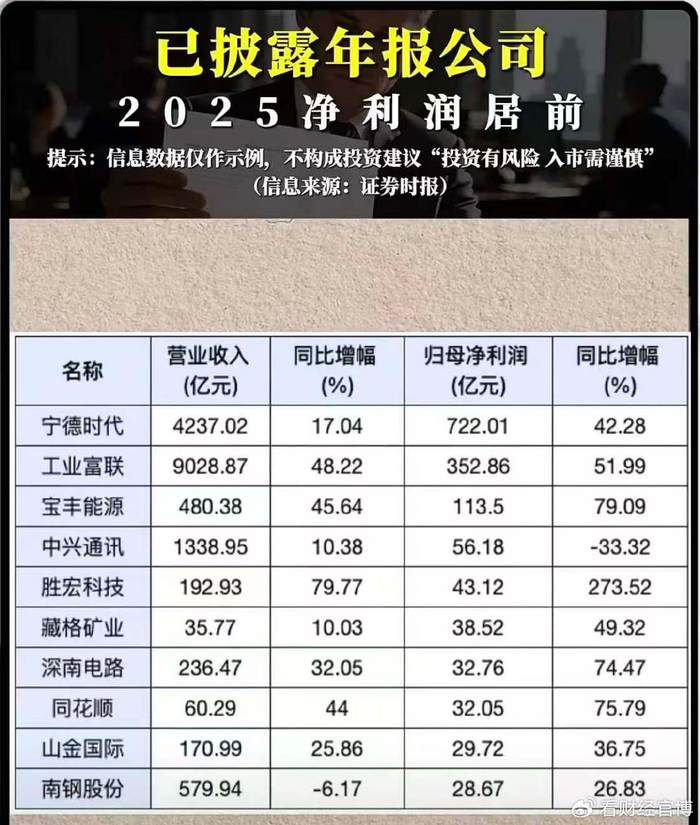 在已披露公司中,工业富联(601138.SH)表现尤为亮眼。公司2025年实现营业收入9028.87亿元,同比增长48.22%;实现归母净利润352.86亿元,同比增长51.99%。无论从营收规模、净利润体量,还是从增长速度来看,工业富联均处于当前已披露A股公司前列。横向比较看,在已披露公司中,宁德时代归母净利润722.01亿元,中信银行706.18亿元,紫金矿业517.77亿元,工业富联352.86亿元处于头部梯队;而从增速看,工业富联又明显快于多数大市值龙头公司,展现出“高基数上的高增长”特征。