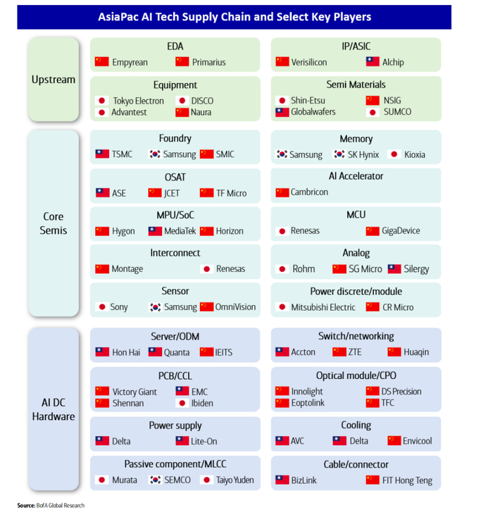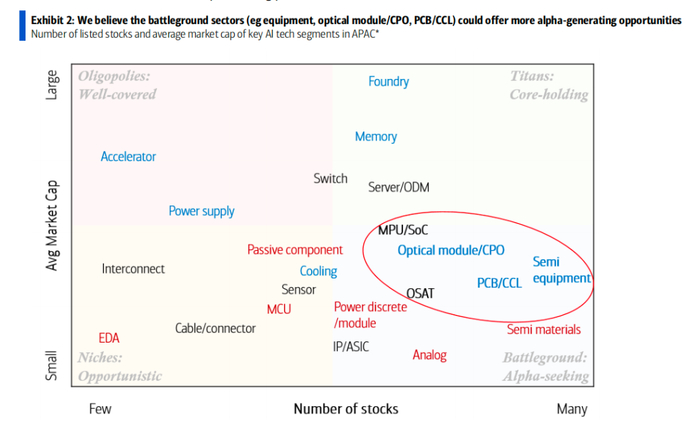 近日,美银证券(BofA Securities)发布《亚太AI科技手册:细分赛道图谱与核心机遇》报告显示,亚太地区AI科技产业链已覆盖22个细分领域,汇聚330余只股票,总市值接近6万亿美元。