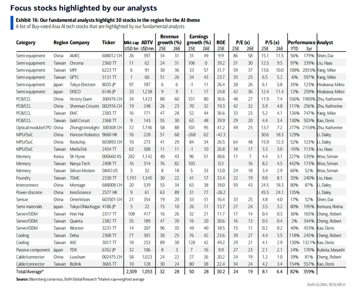 报告中,精选了30只亚太AI科技股票,中国公司包括,中微公司、胜利精密、中际旭创、地平线、长电科技等。