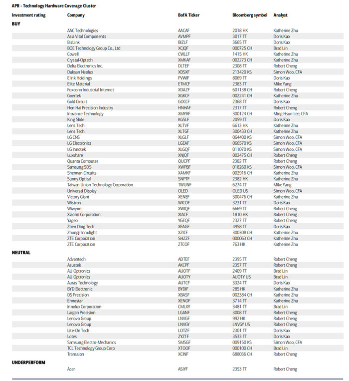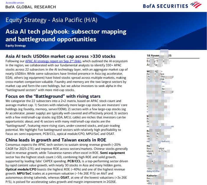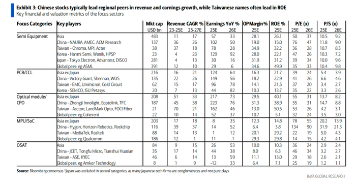 报告指出,中国企业在营收增长端表现突出,台湾地区企业在净资产收益率(ROE)上占据优势,而半导体设备、PCB/CCL、光模块/CPO等五大“战场板块”成为机构眼中的阿尔法收益核心来源,多只中国个股凭借技术突破和市场份额提升获得买入评级。