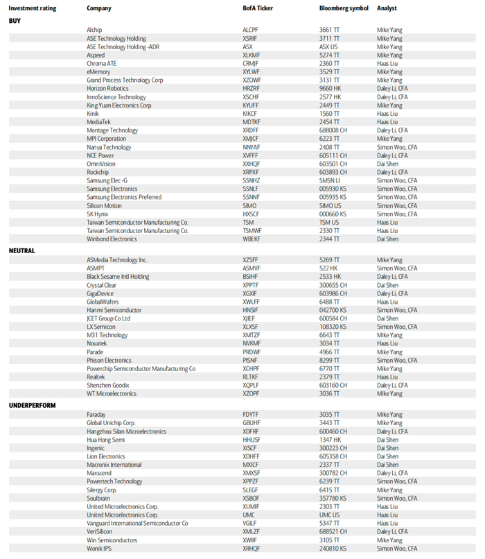 MPU/SoC赛道受益于AIoT和自动驾驶趋势,估值处于溢价水平(26E P/S约14倍),中国企业凭借本地化优势和生态构建,成为行业新兴力量。地平线(9660.HK)专注于自动驾驶SoC,已获得多家车企定点,美银给予买入评级,认为其在L2+级自动驾驶领域的技术积累将驱动2025-27年营收复合增长37%。瑞芯微(603893.CH)在边缘AI计算领域布局深入,拓展汽车电子和机器人市场,同样获得买入评级。