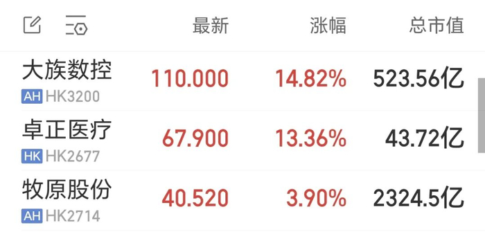 2月6日,港交所迎来三家企业集中上市,分别为深圳市大族数控科技股份有限公司(简称“大族数控”,03200.HK)、卓正医疗控股有限公司(简称“卓正医疗”,02677.HK)及牧原食品股份有限公司(简称“牧原股份”,02714.HK),分别代表了高端制造、医疗服务、农业养殖领域的优质企业。
