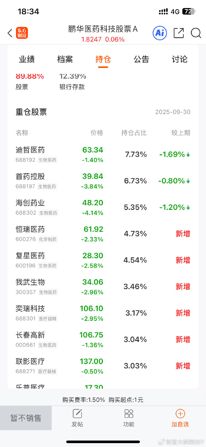 我们来看看2025年3季度末这个基金的持仓情况,主要持有的股票有:迪哲医药、首药控股、海创药业、恒瑞医药、复星医药、我武生物和奕瑞科技等。好多都是中小型的创新药公司,可以说是精心选股了,但不知道能不能扛得住这个调整啊!