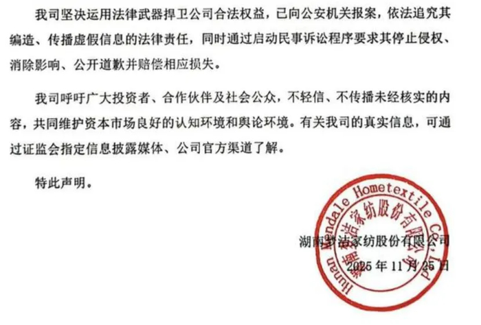 11月25日,梦洁股份发布严正声明,称陈洁相关言论均为“主观臆断与恶意捏造”,与公司实际经营情况、内部管理流程及高管履职行为严重不符,并表示已向GA机关报案。