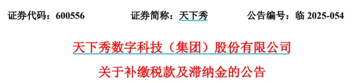 上市公司天下秀(600556.SH)发布了一份公告,披露经公司对涉税业务自查,因双方对税收政策适用条件理解有偏差,导致公司子公司共需补缴税款及滞纳金2451.57万元。本次补缴税款及滞纳金预计将减少公司2025年度净利润约2384.13万元,占公司最近一期经审计归属于上市公司股东净利润的46.3%。