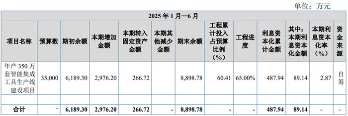 需要注意的是,在德硕科技上市前的在建工程项目中,就有“年产350万套智能集成工具生产线建设项目”,而且早从2021年就开始投建了,截至2025年上半年末,历经3年半时间,还没完工呢,而且工程进度还只有65%;要是按这个进度推算,后年也完不了工呀!