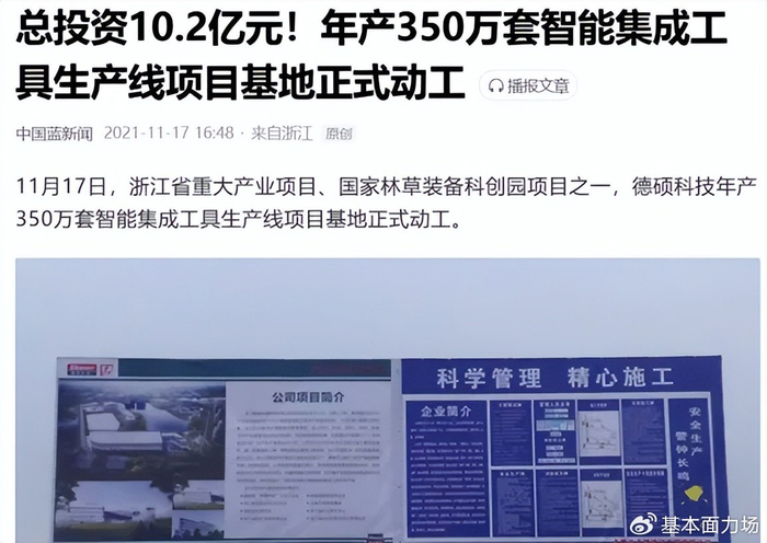 不仅如此,力场君还关注到“中国蓝新闻”此前于2021年11月发布的一篇报道,首先说,这可不是什么小自媒体,这可是浙江广电集团旗下的官方新闻平台,报道标题是《总投资10.2亿元!年产350万套智能集成工具生产线项目基地正式动工》。