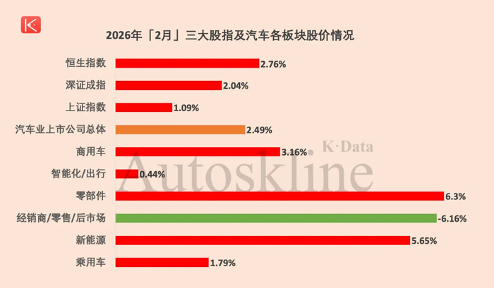 在刚刚过去的2月份,《汽车K线》统计在册的136只汽车股,股价平均上涨2.49%,扭转了1月下跌1.2%的局面,其中超半数个股飘红。
