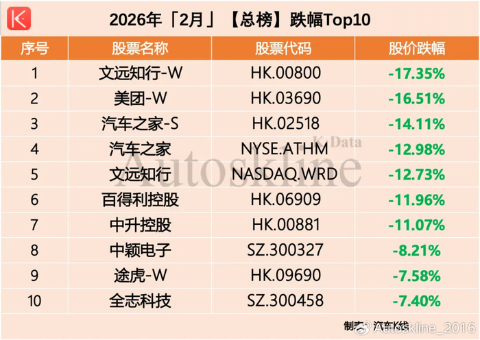 在跌幅TOP10中,同样有熟悉的身影出现,例如文远知行、汽车之家、中升控股、途虎依然出现在跌幅居前的榜单上。