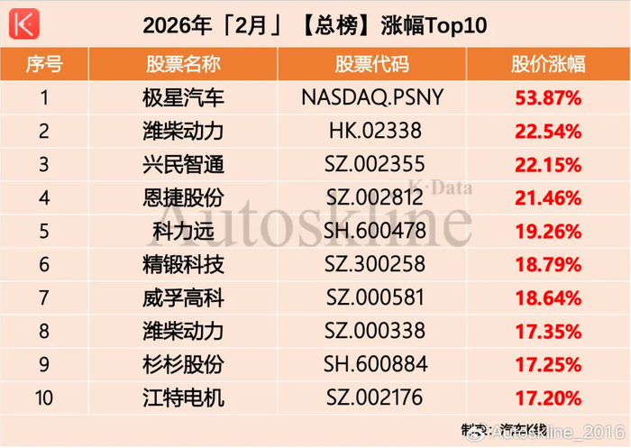 在这份月度榜单涨幅TOP10中,我们看到了熟悉的面孔。例如极星汽车大涨53.87%强势霸榜;威孚高科、科力远、江特电机这些出现在第7周涨幅榜中的上市公司,依然挺立在月度涨幅榜上。
