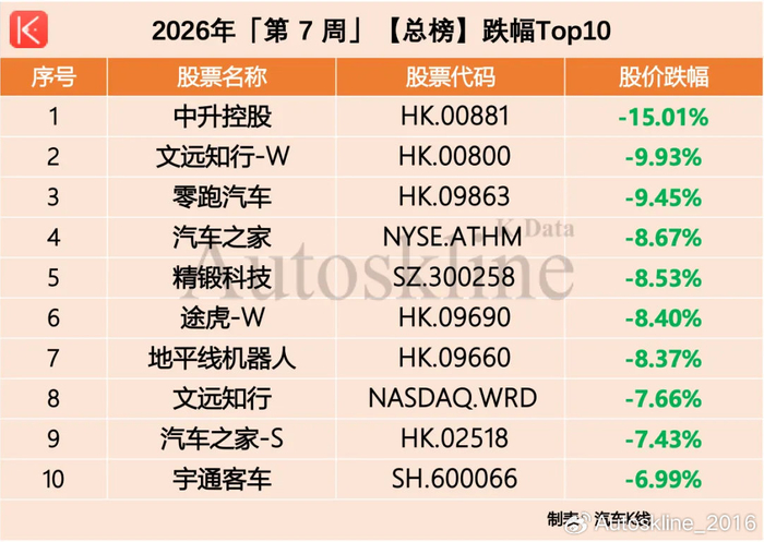 上周,中升控股下跌15.01%垫底,文远知行和零跑汽车两家港股上市公司跌幅均超过9%,跻身跌幅前三;此外还有汽车之家、精锻科技、途虎、地平线机器人、宇通客车上榜。