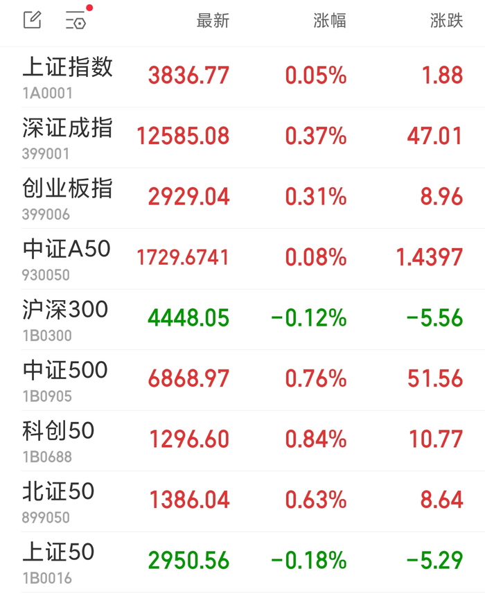 中新经纬11月24日电 周一,A股三大指数集体高开,此后探底回升。截至收盘,上证指数涨0.05%,报3836.77点;深证成指涨0.37%,报12585.08点;创业板指涨0.31%,报2929.04点。