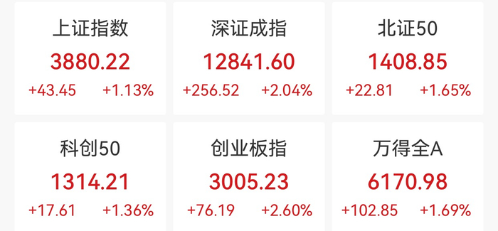 中新经纬11月25日电 25日上午,A股三大指数高开高走,创业板指领涨。截至午盘,上证指数涨1.13%,报3880.22点;深证成指涨2.04%,报12841.60点;创业板指涨2.60%,报3005.23点。