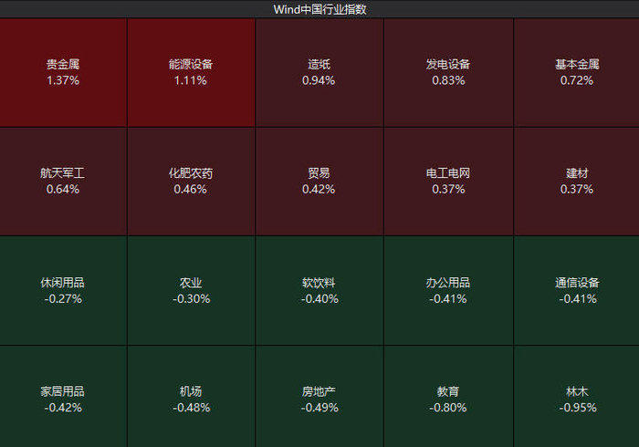 盘面上,贵金属、 航天航空等板块涨幅居前,教育、酿酒板块跌幅居前。