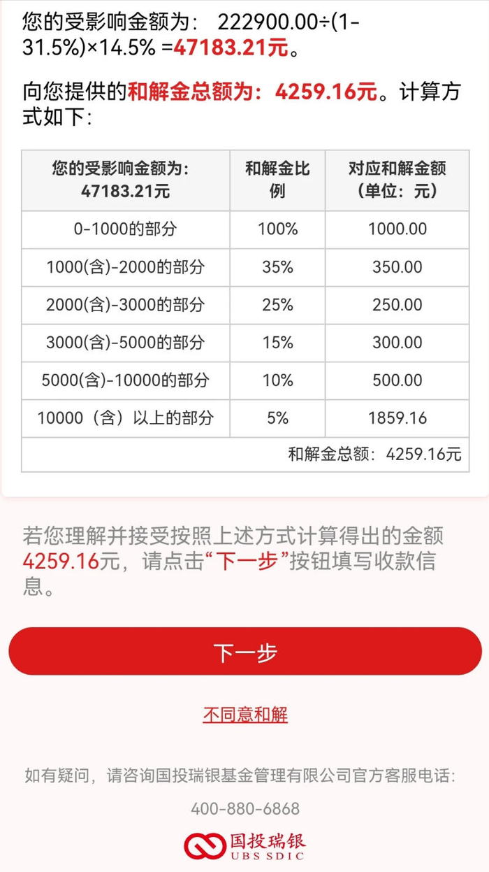 陈先生的和解金额为4259.16元 来源:受访者供图“看到这个方案时,我的第一感觉就是愤怒,甚至觉得被耍了。”在陈先生看来,方案规定1000元以下投资者的损失全额赔付,而损失数万元的投资者只能获得比例补偿,非常不公平。