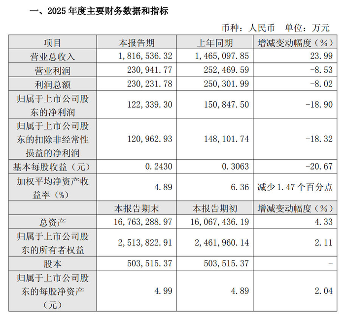 中新经纬3月12日电 12日盘后,陆家嘴披露2025年度业绩快报,全年实现营收181.65亿元,同比增长23.99%;归母净利润为12.23亿元,同比下降18.90%。2025年末,公司总资产1676.33亿元,较年初增长4.33%;归属于上市公司股东的所有者权益251.38亿元,较年初增长2.11%。