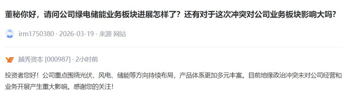 【V观财报丨越秀资本:地缘政治冲突未对公司经营和业务开展产生重大影响】越秀资本3月23日在投资者互动平台回复提问表示,公司重点围绕光伏、风电、储能等方向持续布局,产品体系更加多元丰富。目前地缘政治冲突未对公司经营和业务开展产生重大影响。(中新经纬APP)