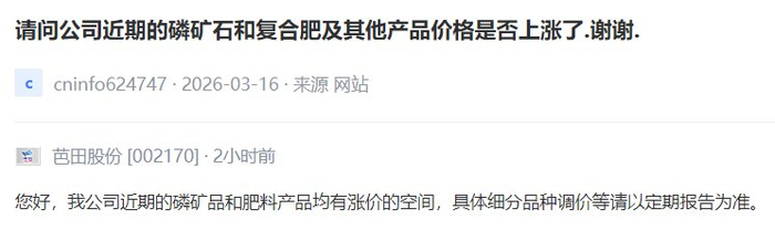 【V观财报丨芭田股份:公司近期的磷矿品和肥料产品均有涨价的空间】芭田股份3月25日在投资者互动平台回复提问表示,公司近期的磷矿品和肥料产品均有涨价的空间,具体细分品种调价等请以定期报告为准。(中新经纬APP)