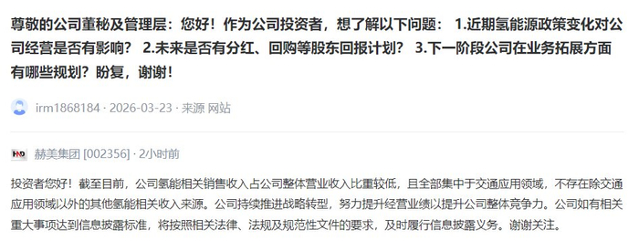 【V观财报丨赫美集团:公司氢能相关销售收入占公司整体营业收入比重较低】赫美集团3月26日在投资者互动平台回复提问表示,截至目前,公司氢能相关销售收入占公司整体营业收入比重较低,且全部集中于交通应用领域,不存在除交通应用领域以外的其他氢能相关收入来源。(中新经纬APP)
