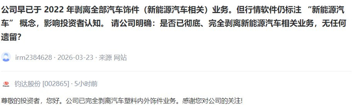 【V观财报丨钧达股份:公司已完全剥离汽车塑料内外饰件业务】钧达股份3月26日在投资者互动平台回复提问表示,公司已完全剥离汽车塑料内外饰件业务。(中新经纬APP)