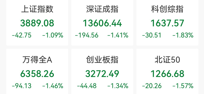 中新经纬3月26日电 26日,A股低开低走,三大指数跌超1%。上证指数跌1.09%,报3889.08点;深证成指跌1.41%,报13606.44点;创业板指跌1.34%,报3272.49点。