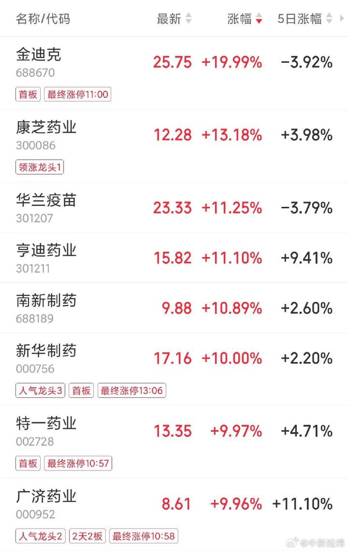 A股市场上,11月25日,抗流感概念股集体走高。其中,金迪克、新华制药、特一药业、广济药业、海南海药、北大医药涨停,康芝药业涨超13%,华兰疫苗、亨迪药业涨超11%。