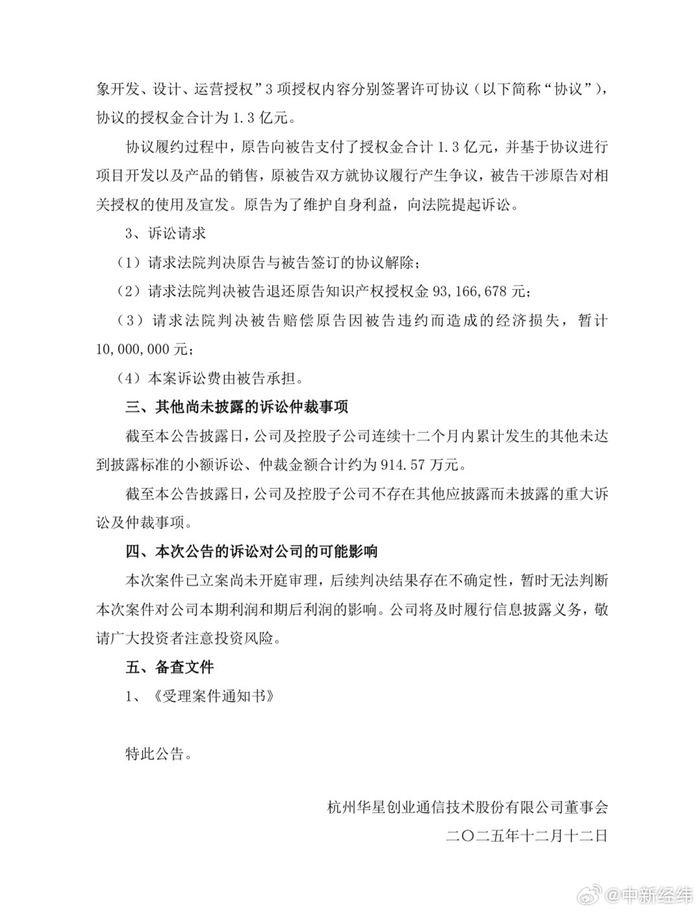【#三体宇宙被起诉索赔1个亿#】#三体宇宙被起诉索赔超1亿#12月11日,华星创业发布重大诉讼公告。公告显示,华星创业因与三体宇宙(上海)文化发展有限公司发生知识产权合同纠纷,向上海市徐汇区人民法院提起诉讼,目前案件已被受理。2023年2月,华星创业与三体宇宙就《三体》作品在授权范围内的“一款AR应用程序及AR联名设备授权”、“元宇宙社区授权”、“作品中一个主要人物的虚拟形象开发、设计、运营授权”3项授权内容分别签署许可协议,协议的授权金合计为1.3亿元。华星创业称,公司支付了授权金合计1.3亿元,但公司与三体宇宙就协议履行产生争议,三体宇宙干涉公司对相关授权使用及宣发。华星创业起诉请求双方签订的协议解除,并请求法院判决三体宇宙退还知识产权授权金9317万元,加上因三体宇宙违约而造成的经济损失1000万元,合计约为1.03亿元。